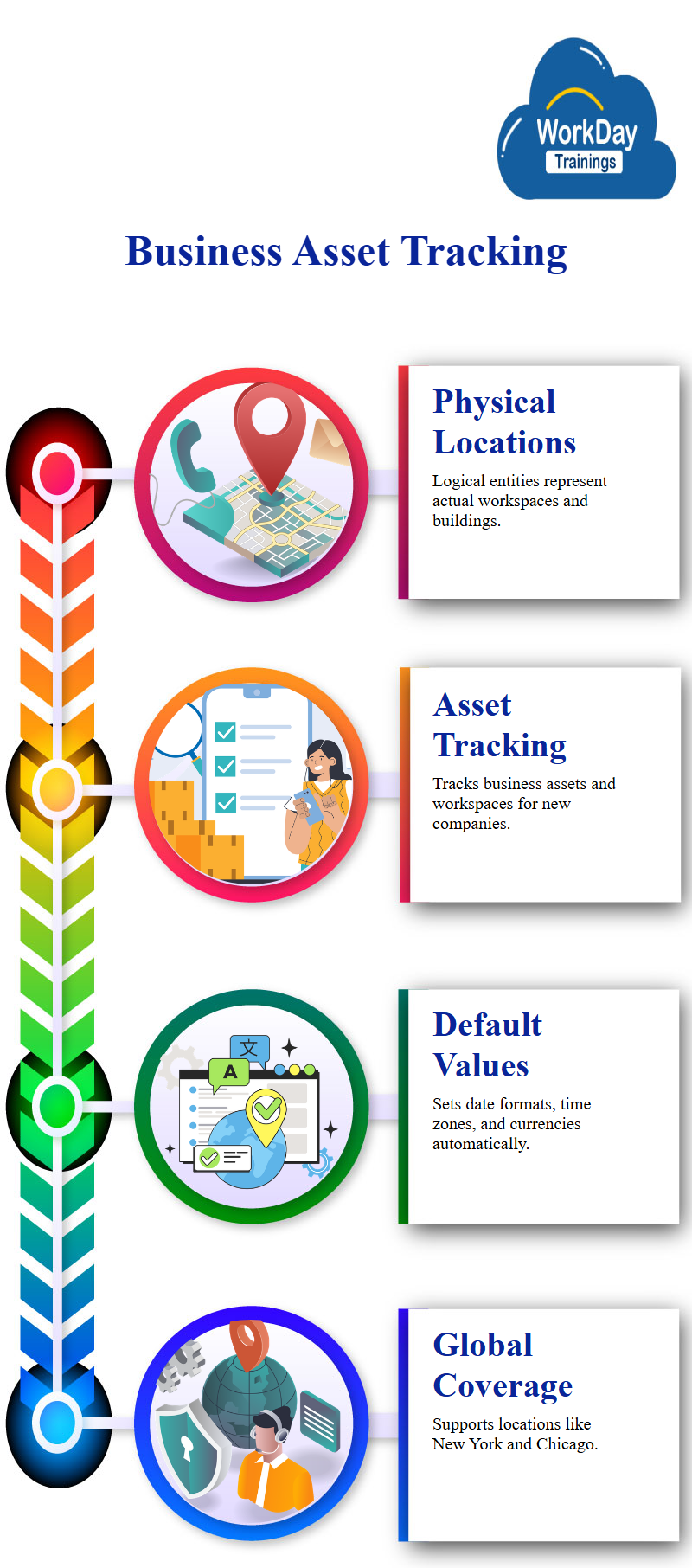 Workday creates physical locations for new companies, such as those in New York and Chicago, to track business assets and physical workspaces. These locations are logical entities for the actual physical workspaces or buildings and are used to default certain data values like date formats, time zones, and currencies.