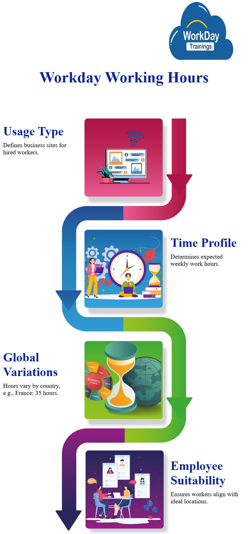 When hiring workers into a location, it must have a usage type as a business site. This includes setting the time profile, which determines the expected Workday work hours per week for a full-time employee.