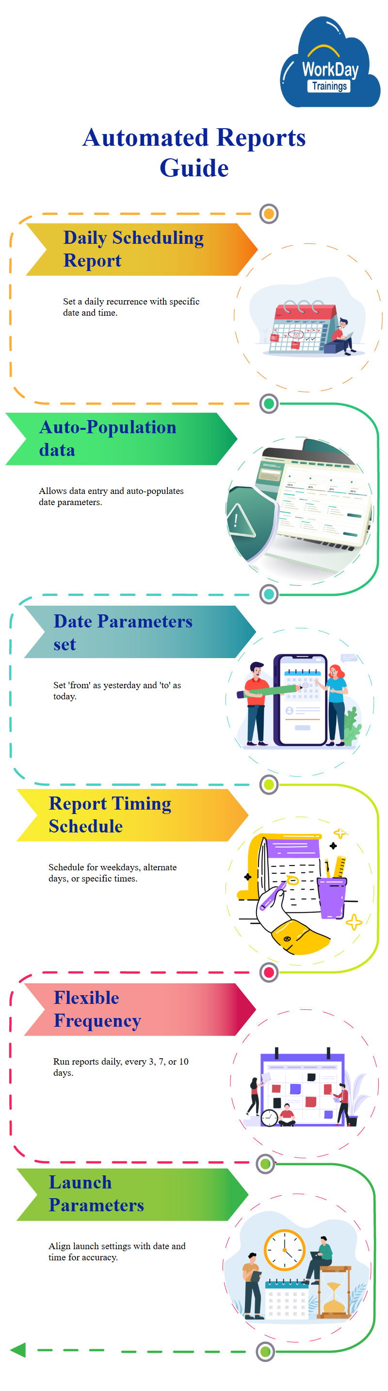 To schedule custom reports, users can go to related actions and select the Workday custom report. The Automated Report Generation Guide provides a comprehensive guide on scheduling a report in a spreadsheet, with options for daily recurrence and output formats.