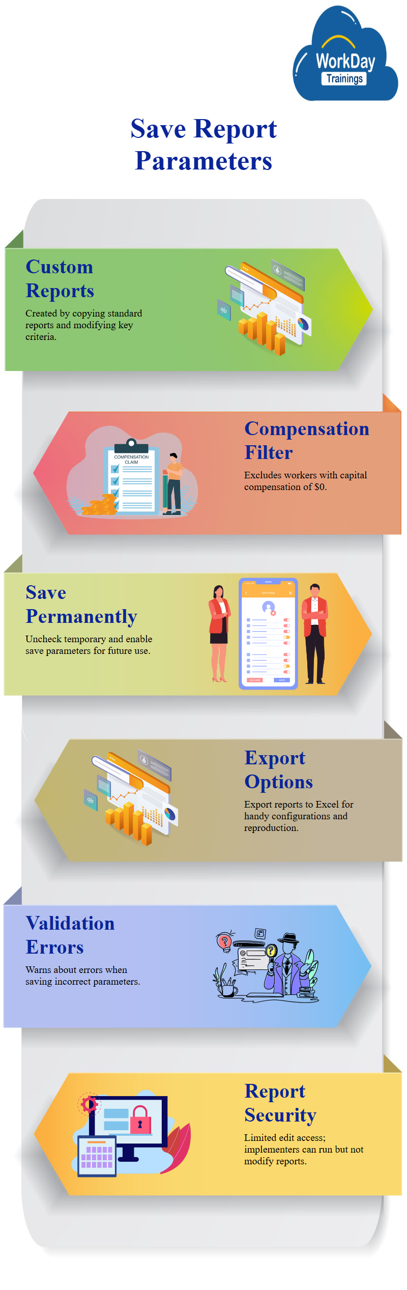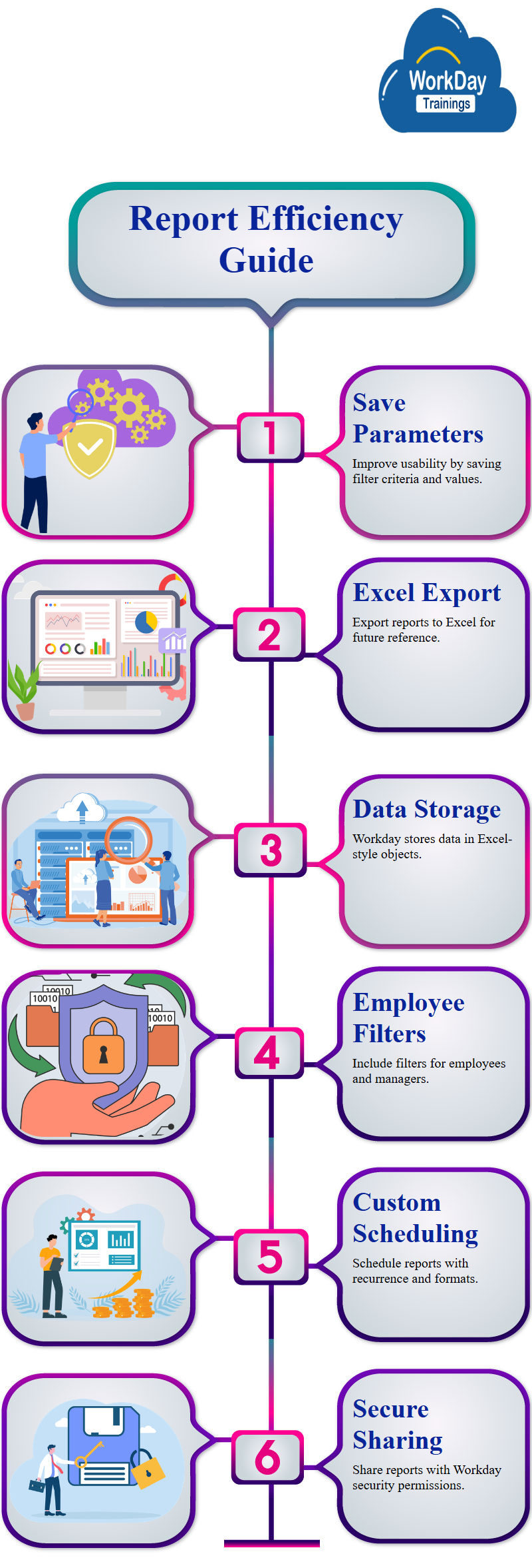 Enabling save parameters in reports improves usability and efficiency. The report provides a detailed guide on saving filter criteria, values, and other information, and exporting to Excel allows users to keep the configuration handy for future reference.