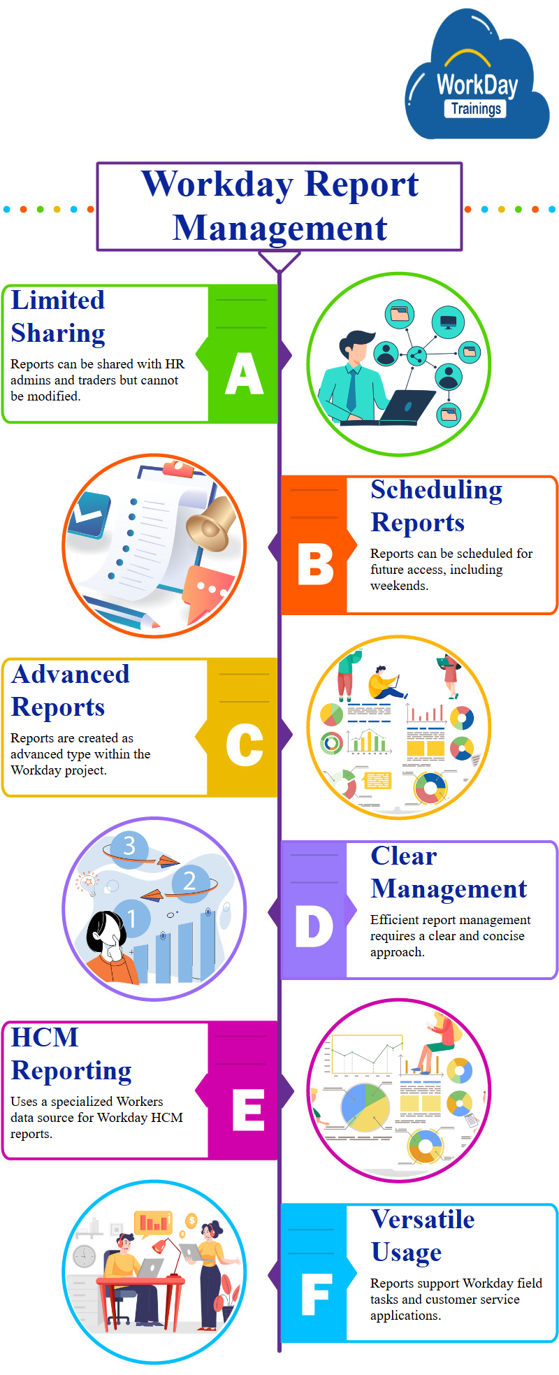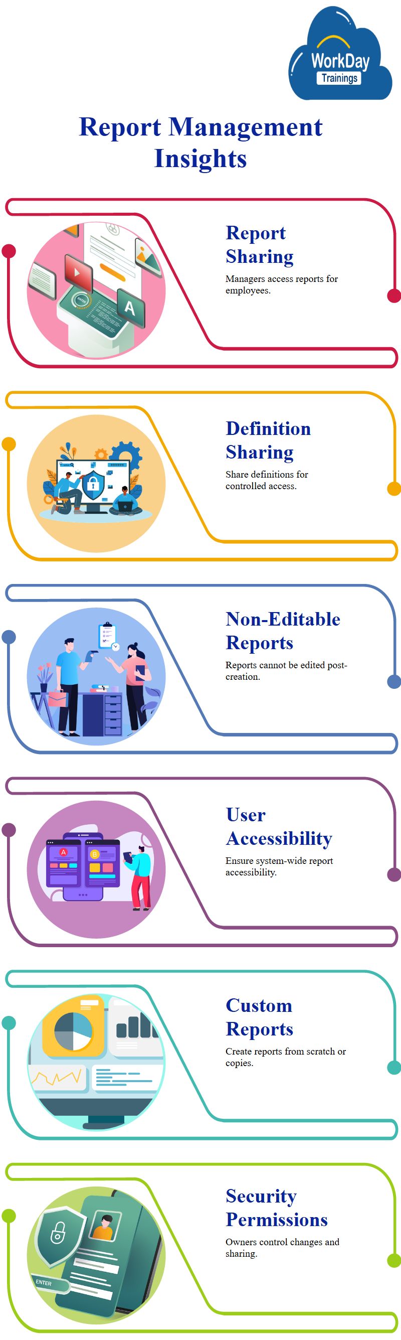 Therefore, we can sum up by saying Workday provides both standard and custom reports, which can be created and managed using the Workday Report Writer tool. Custom reports can be created from scratch or copied from existing ones, and the report owner has Workday security permission to make changes or share them with others.