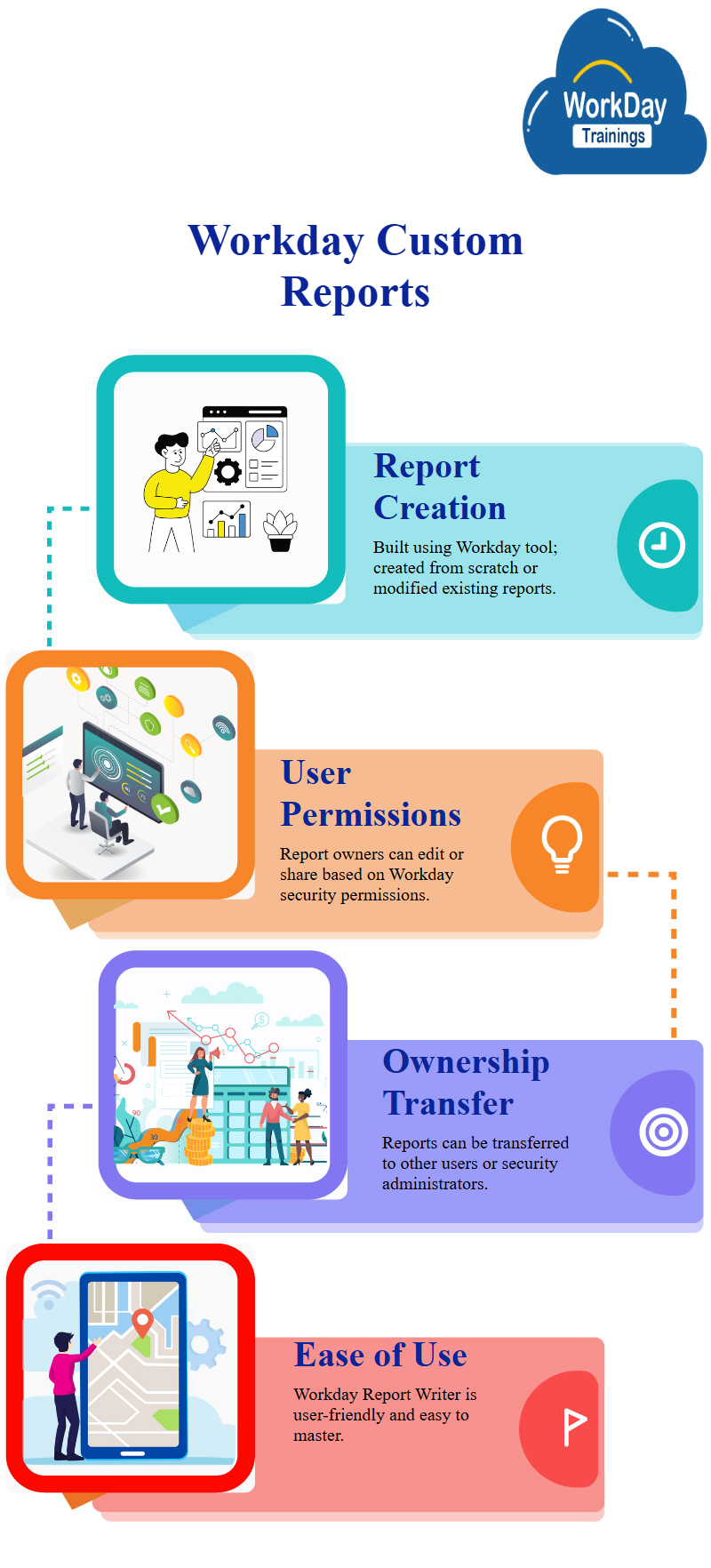 Custom reports are designed and built using the Workday Report Writer tool, which is designed for general users. They are easy to learn, manage, and master.