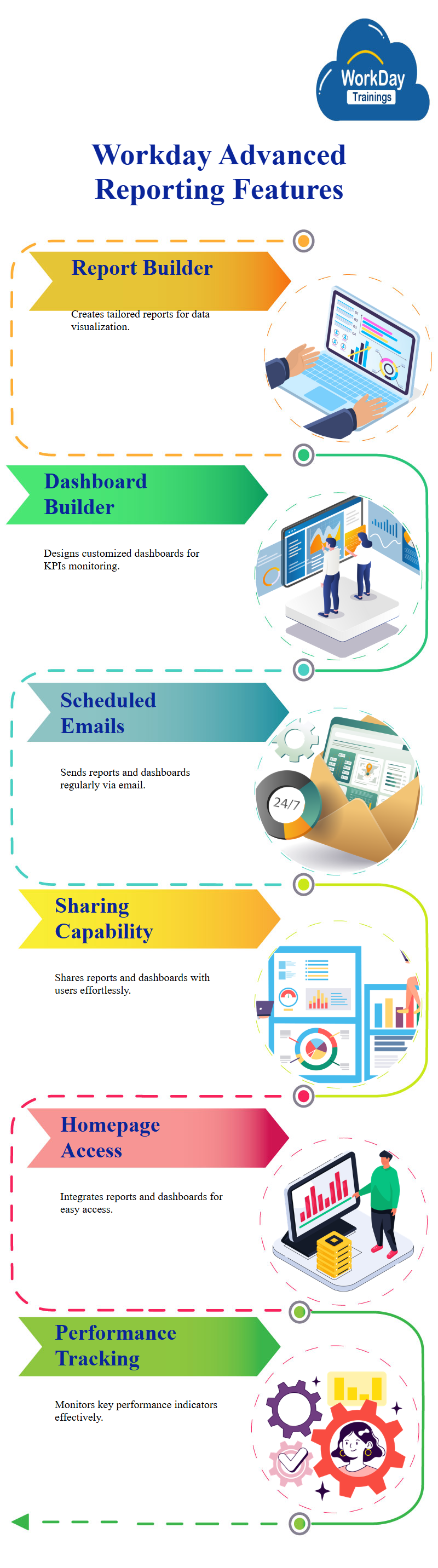Advanced Reporting in Workday provides users with the ability to create custom reports and dashboards to better visualize data and monitor key performance indicators. Advanced Reporting features include: