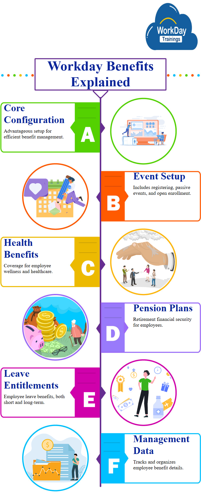 Workday Benefits are comprehensive of different subject matters like core advantageous configuration. You can also avail variety of benefits like setting up of events, events of registering, passive events and open enrollment. Now, going into more depth, there are various variety of workday benefits. Let me explain it to you more clearly. As every organization provides different types of benefit to the employees which includes health benefits, pension, leave benefits and retirement. Management is required to have the particular information of all the benefits which are later to be acquired by the employees.