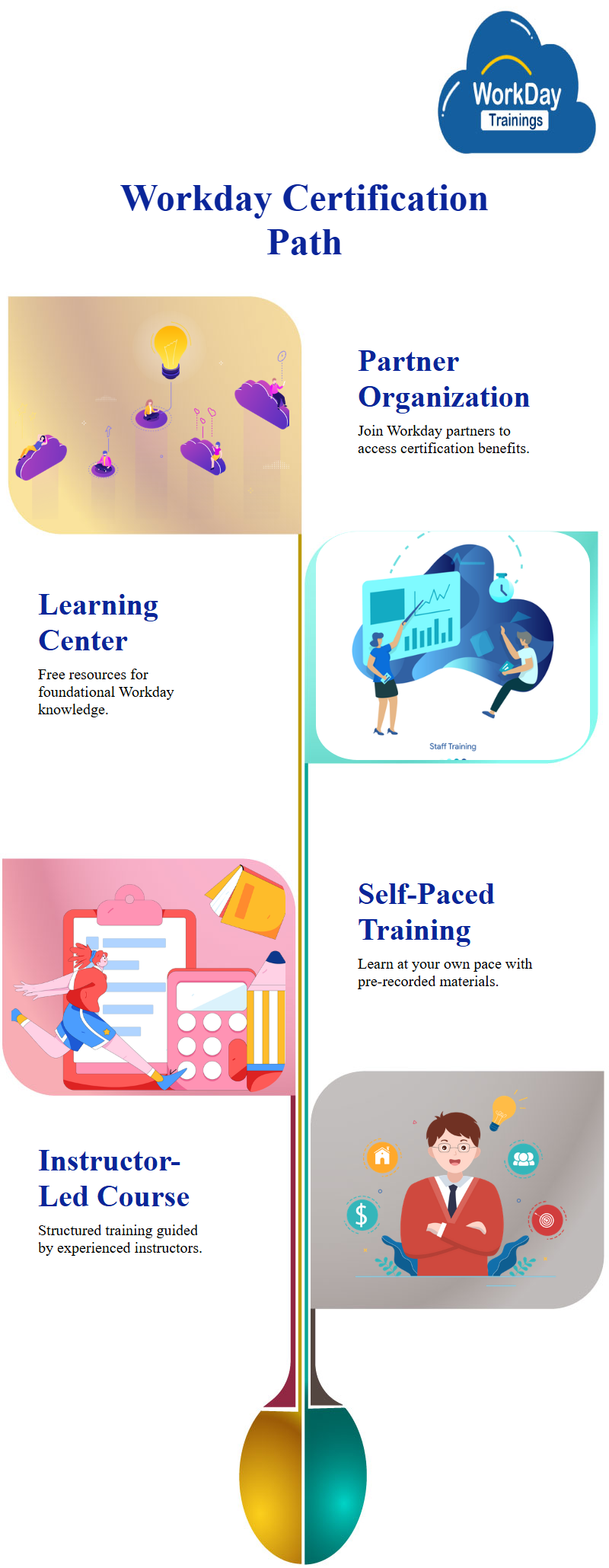 Your initial step would be to join a workday partner organization to avail the Workday benefit Certification. You can also look for Workday Learning Center free of charge to get a basic idea about the basics of the route.