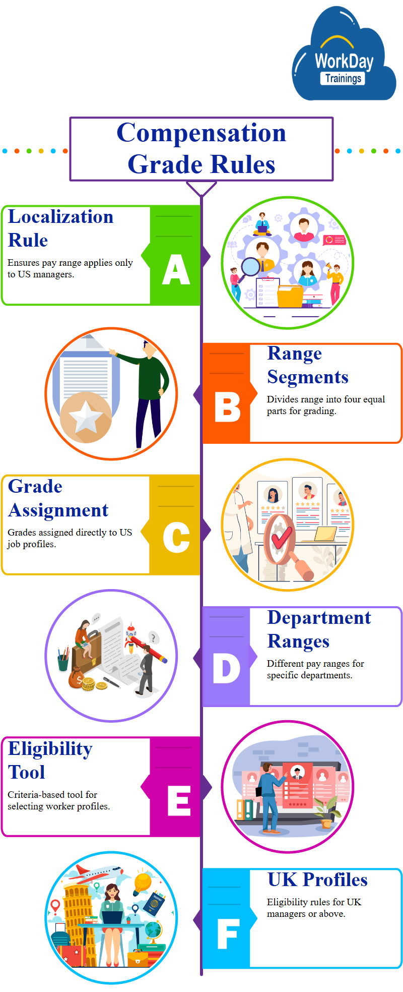 The compensation grade is not required to have an eligibility rule, as it is directly assigned to the job profile. The grade profile is used to identify the pay range for US or UK managers. To select the subpopulation of workers, an eligibility rule is defined based on criteria.