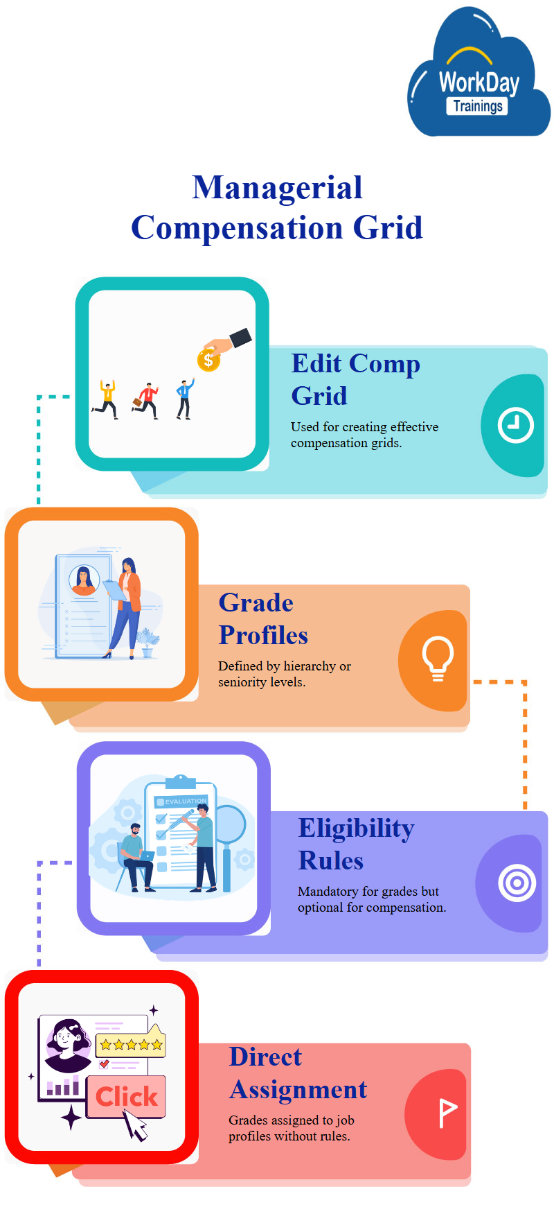 Assigning the compensation grid to workers can be done directly to the job profile or using eligibility rules. Large organizations with 300,000 employees can use this approach, but smaller Workday organizations can also manage it.