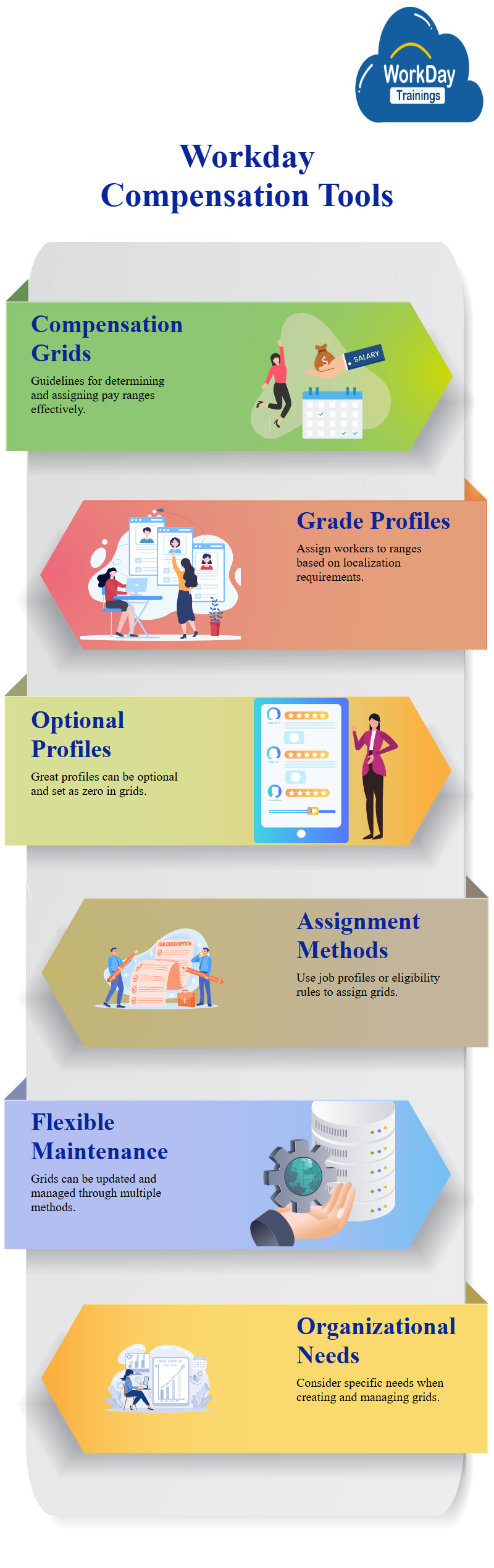 Compensation grids and grid profiles are tools used to assign workers to different compensation ranges. A Workday compensation grid is a guideline for determining pay ranges, while great profiles allow for the assignment of workers to different ranges based on localization requirements.