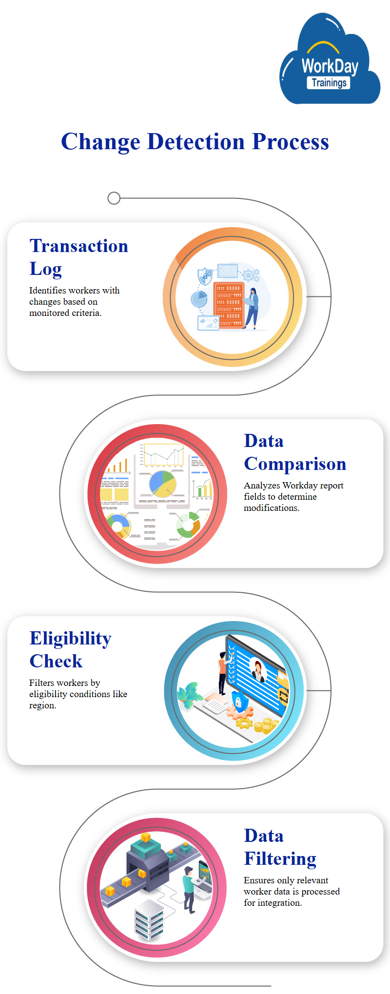 Workday’s core connector worker integration uses a three-step process to detect and report changes. It first looks at the transaction log to determine which workers have changes related to the changes you are looking for.
