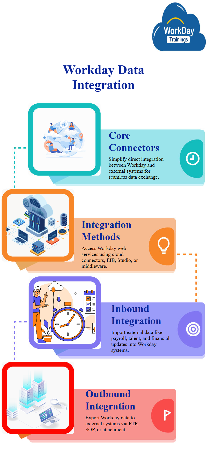 Outbound Workday integration involves obtaining data from back-end functional areas, Workday business objects, and data sources, and delivering it to external systems via FTP, SOP, or as a Workday Workday attachment.