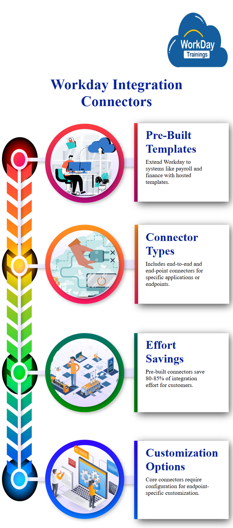Workday connectors are pre-built integration templates that extend Workday functionality to external systems like payroll, Workday finance, and spend. These templates are hosted and maintained by Workday, who provide upgrades and support for any issues.