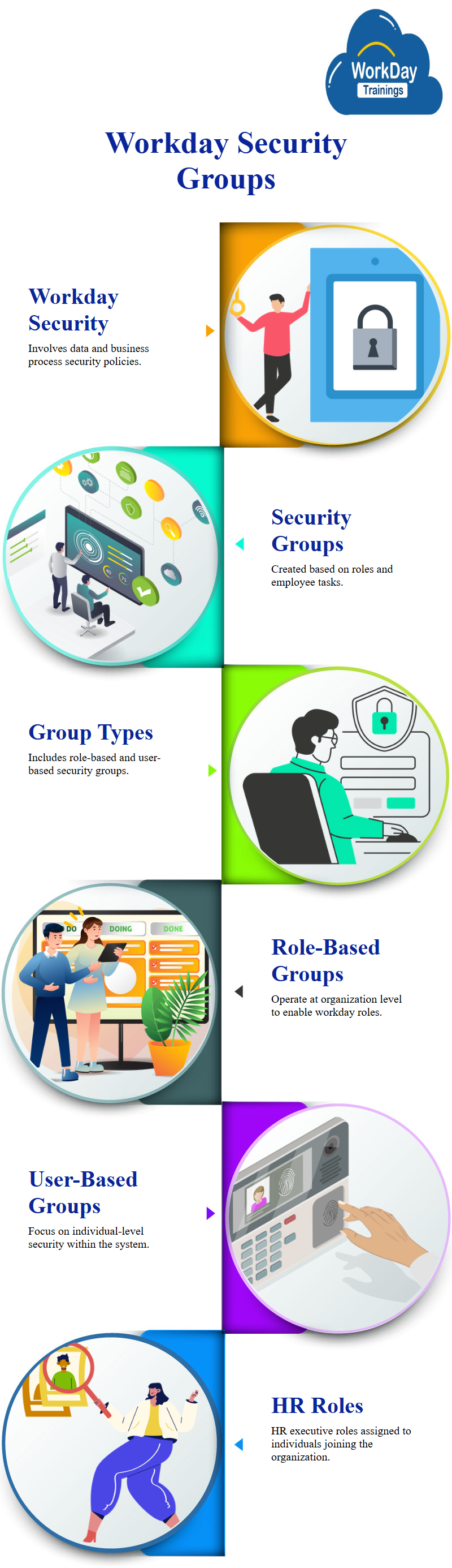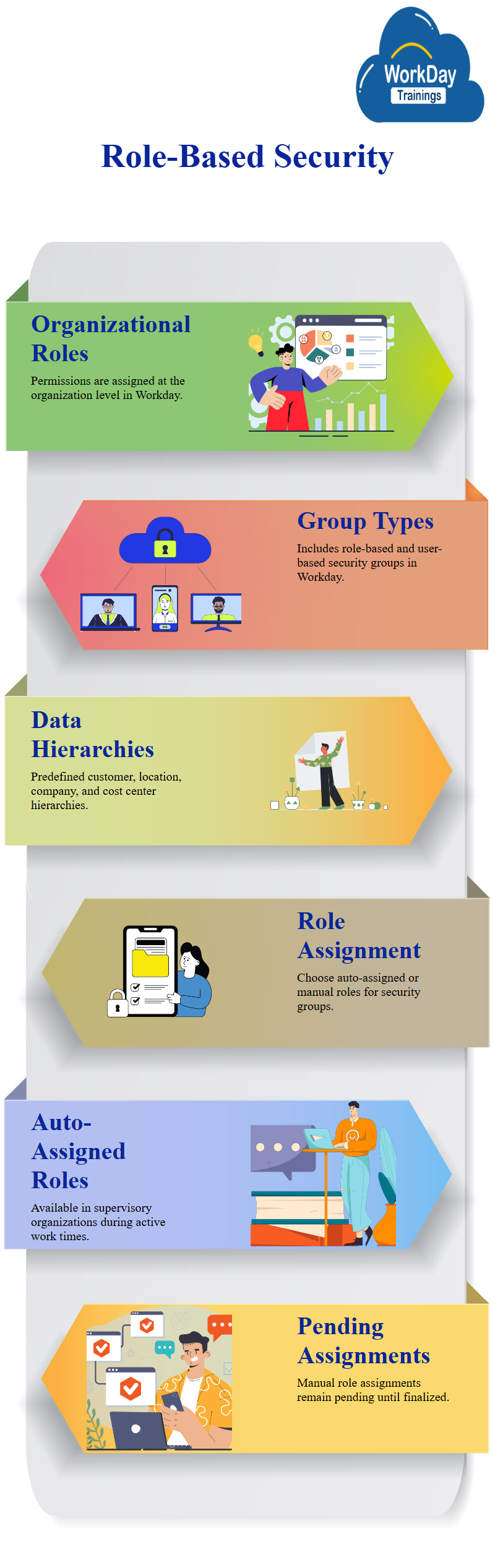 There are two significant types of security groups: role-based and user-based. Role-based security groups’ workdays work on the organization level, with three types of information: predefined customer, location company, cost center and region, and hierarchy.