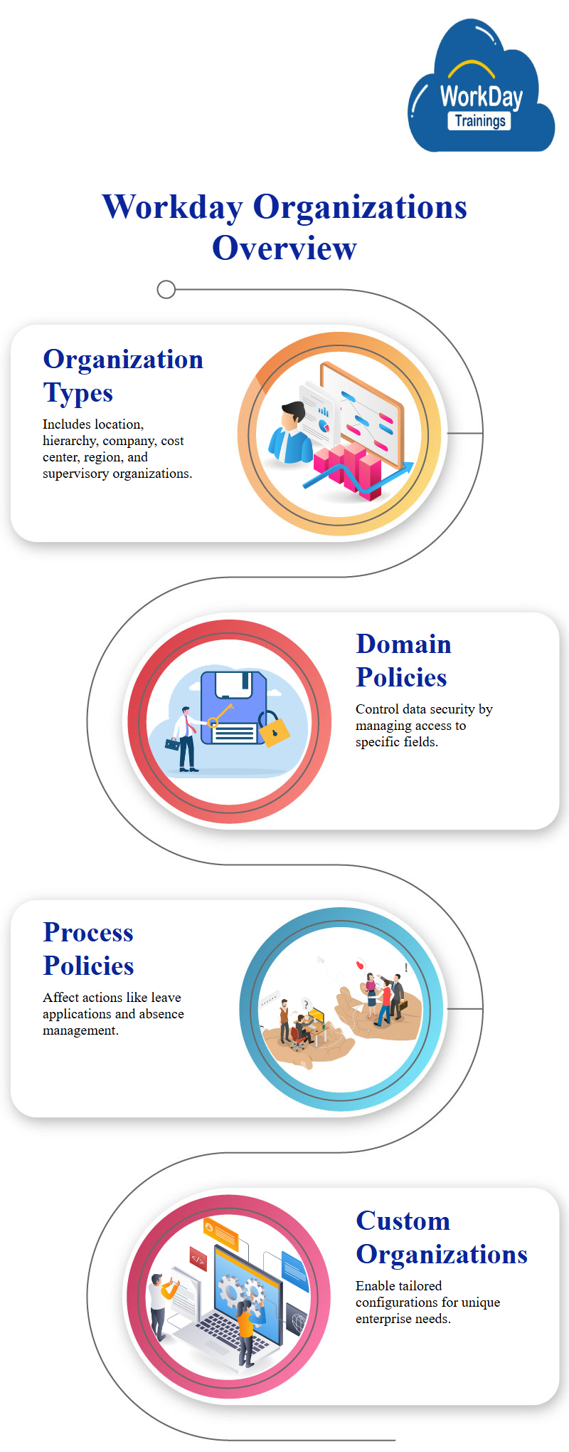 Each workday organization has eight types: location, location hierarchy, company workday company hierarchy, cost center hierarchy, area and region hierarchy, custom organization’s, and supervisory workday organizations.