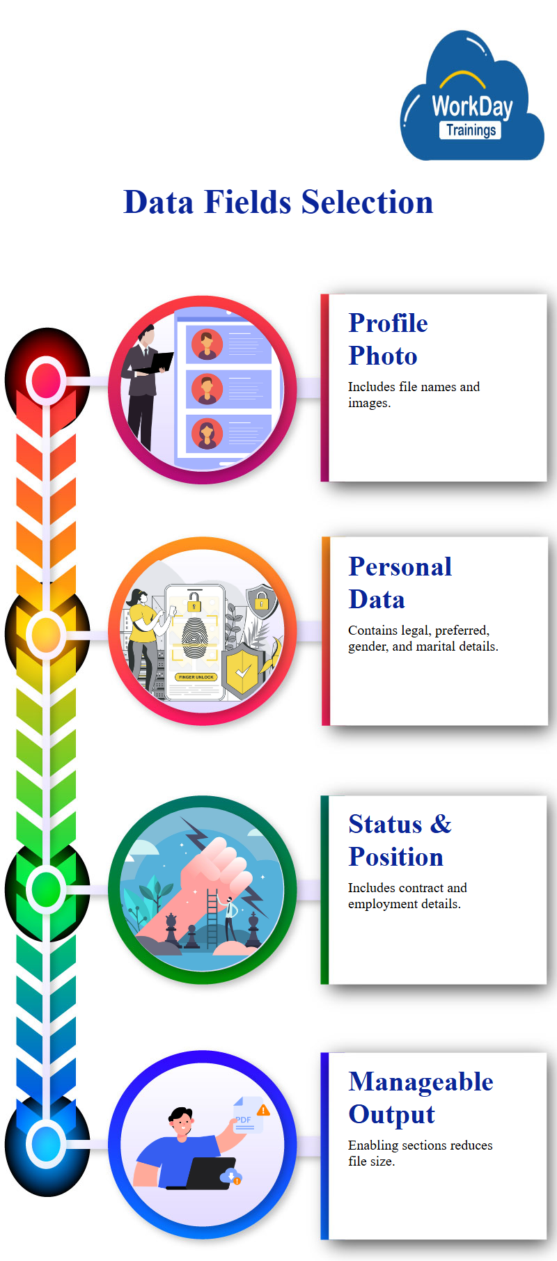 For example, the profile photo field can include file names and images, while the personal data section can consist of legal, preferred, gender, birthday, marital status, etc.