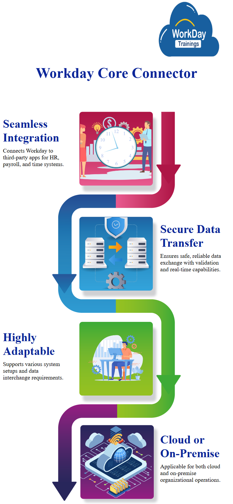 Using the Workday Core Connector, organizations can connect their Workday systems to third-party apps and systems, including human resources, payroll, time and attendance, and timekeeping systems. This integration applies to organizations operating out of the cloud or on-premise.
