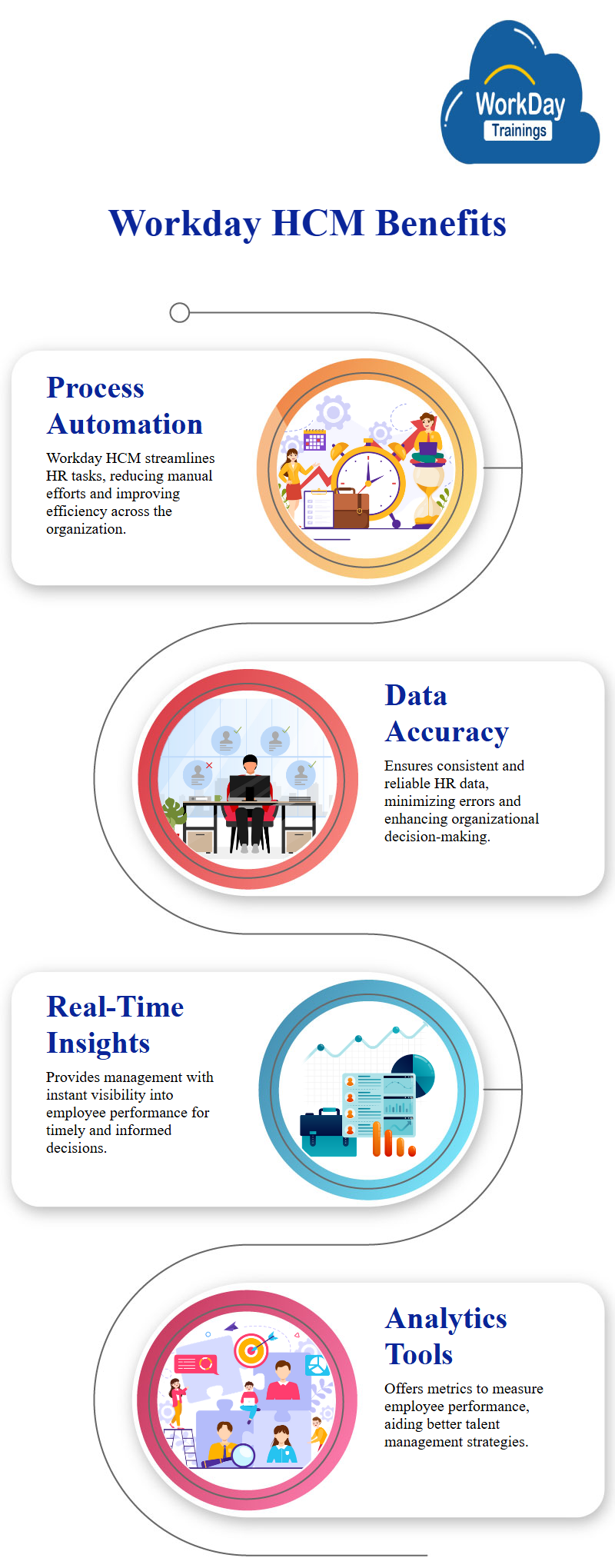 It also provides management with real-time visibility into employee performance and progress, allowing for timely decision making. Furthermore, Workday HCM offers a range of analytics tools that can be used to measure and track employee performance, enabling organizations to make better decisions about their talent pool.