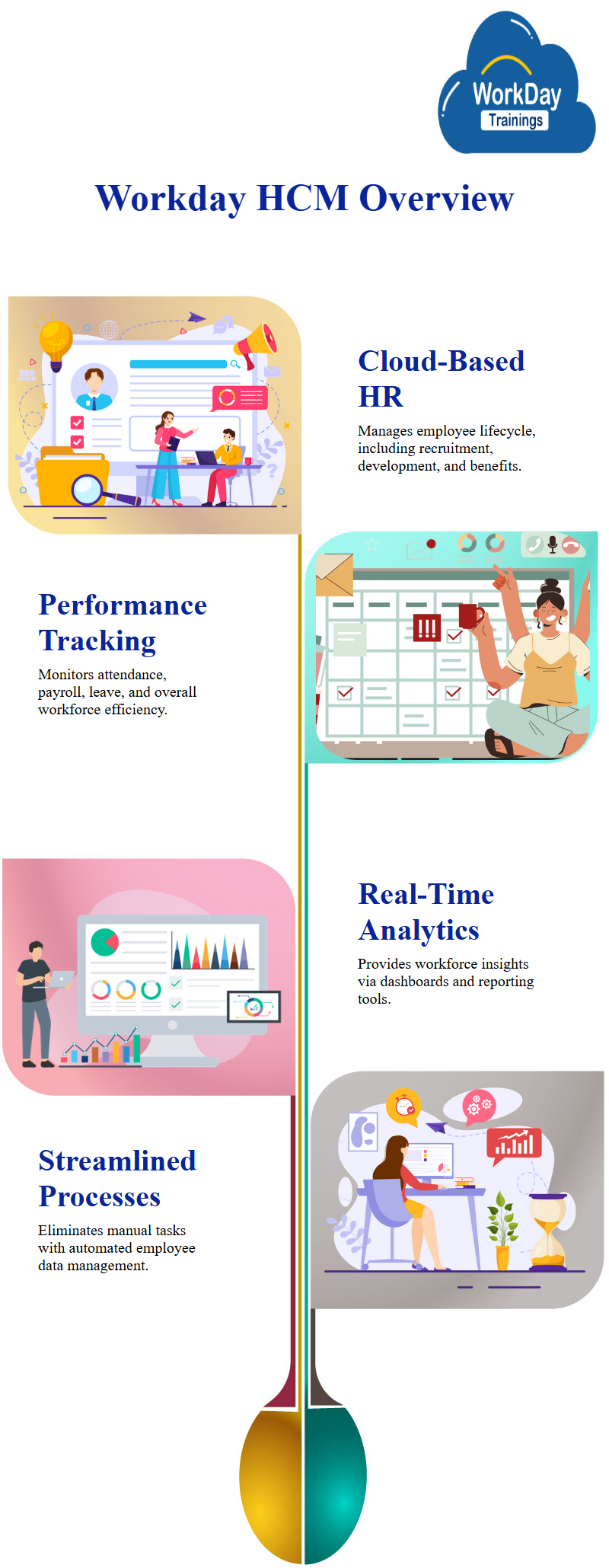 Workday HCM (Human Capital Management) is a cloud-based human resource and talent management platform. It provides solutions for managing the entire employee lifecycle and helps organizations to recruit, develop, and manage their employee base. This platform helps in managing and tracking employee performance, attendance, leave, payroll, and benefits. It also provides analytics and reporting capabilities.