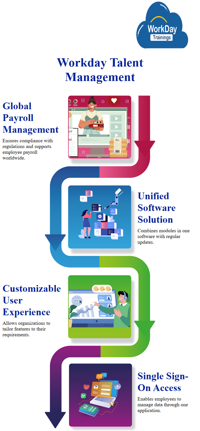 - Talent Management, This module of Workday HCM allows an organization to manage its talent pool and provide growth opportunities to them. This module also helps the organization decide the company’s future direction and retain the best talent in the industry.