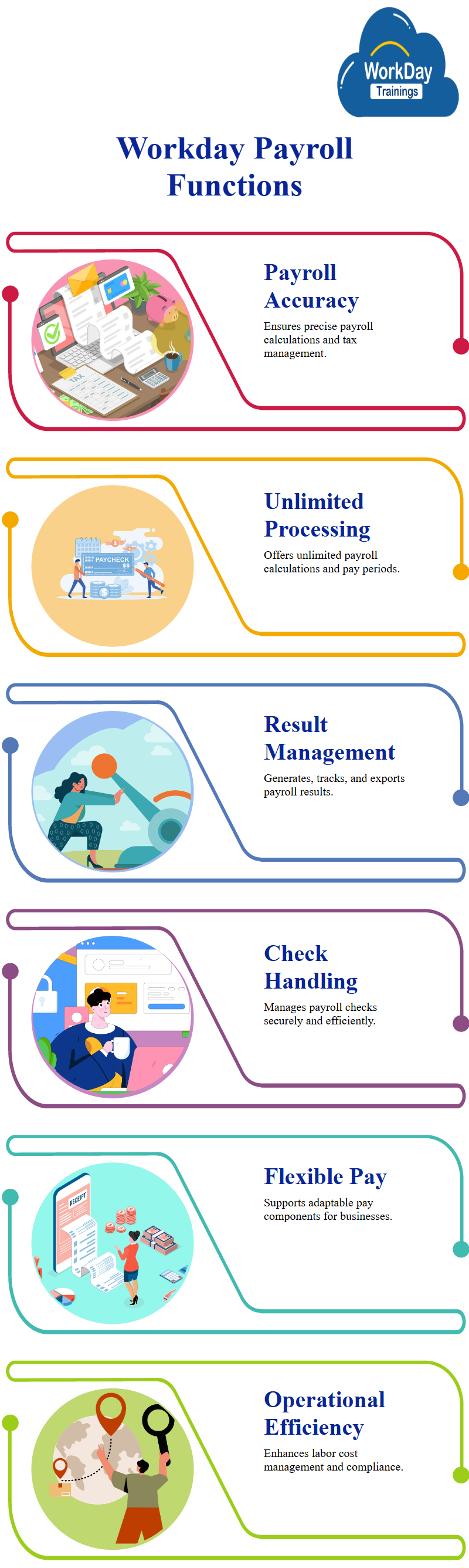 - Workday Payroll provides complete and accurate payroll calculations, and you can also manage taxes and deductions and track employee time.