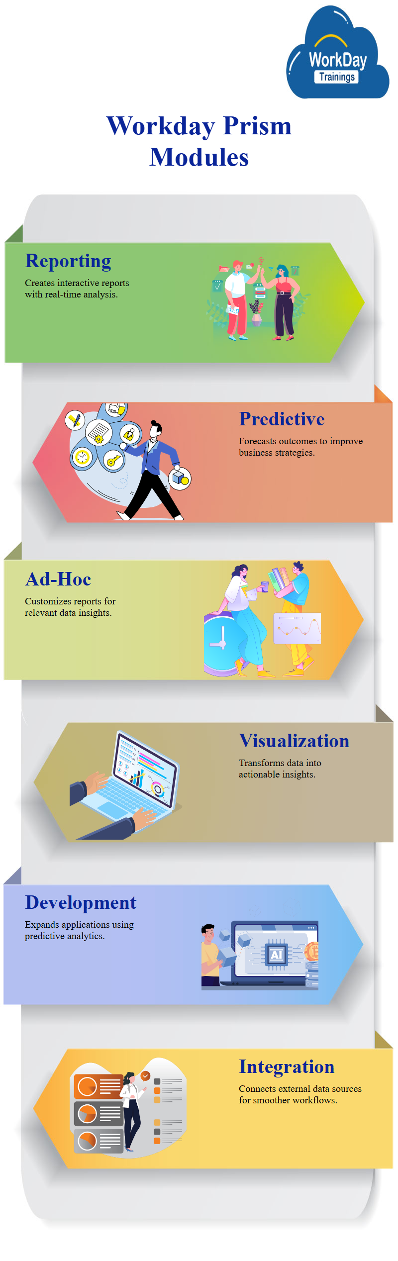 - Workday Reporting and Analytics: This module helps to develop robust, interactive reports and analyze data in real time.