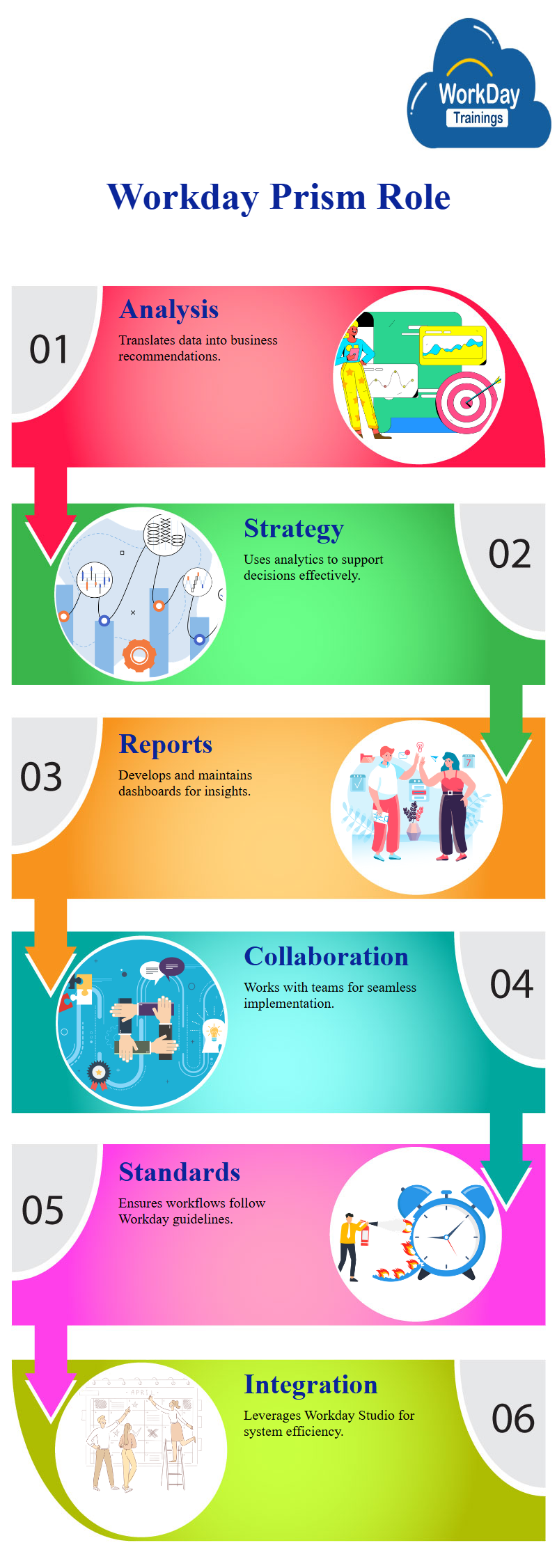 - Workday Prism Analytics Consultant, also called Workday Analytics Consultant, builds strong relationships with the implementation and integration teams to ensure that solutions are built following Workday standards and workflows and that the Workday Studio development platform is leveraged appropriately during the implementation process.