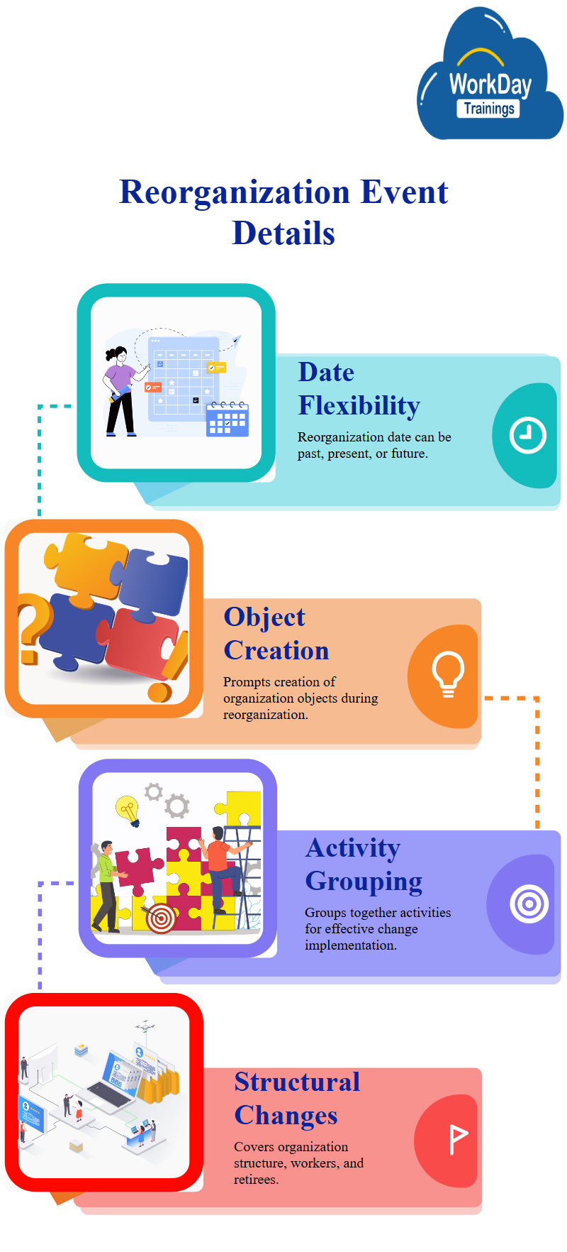 A reorganization event is an event that groups together common tasks and activities related to creating new workday organizations, including structural changes, deletions, and hierarchical structure changes.
