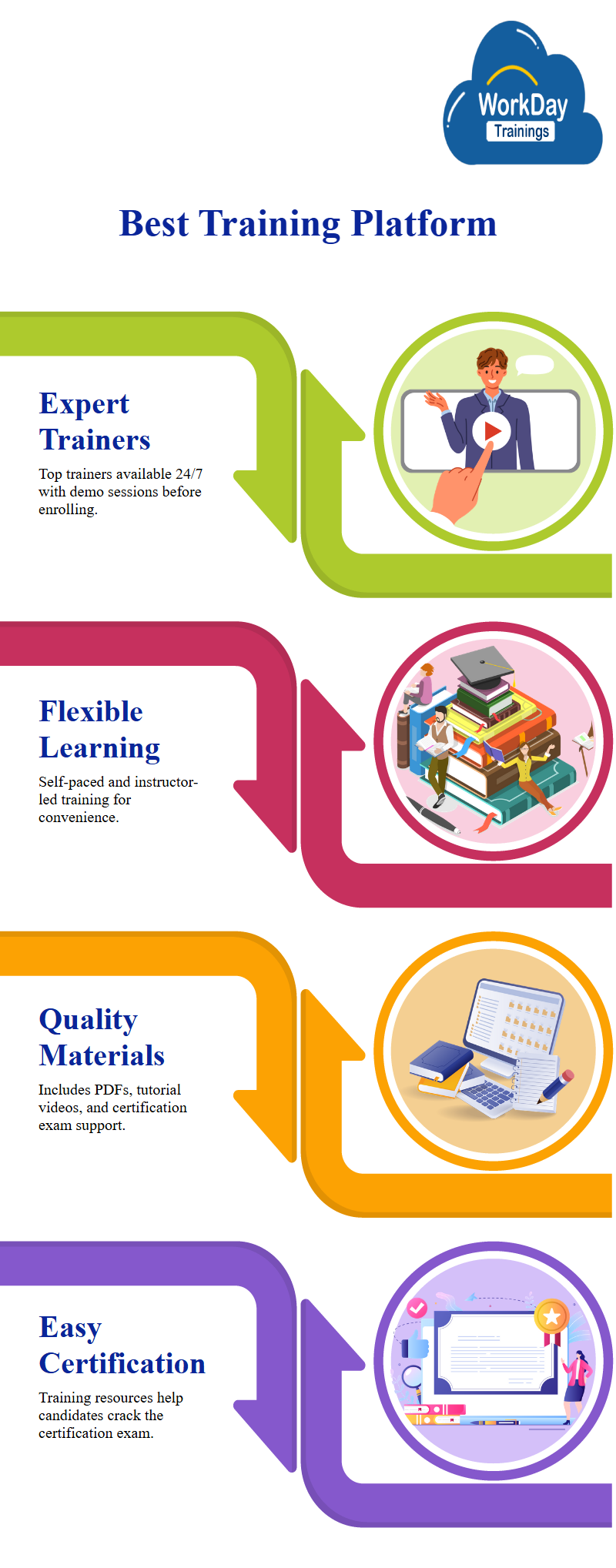 It has best trainers who are available24 X 7, you can attend to their demo sessions before enrolling and they also provide both self-paced and instructor led training.