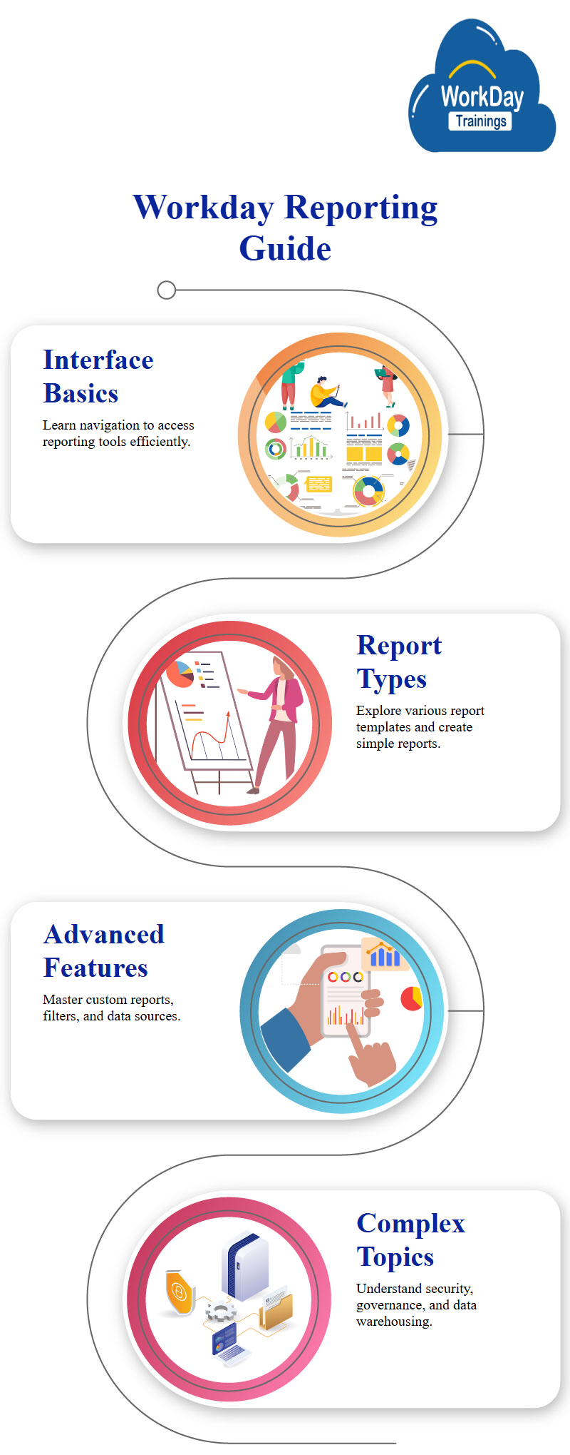 - As you become more comfortable with Workday reporting, you can start exploring more complex topics such as report security, data governance, and data warehousing.
