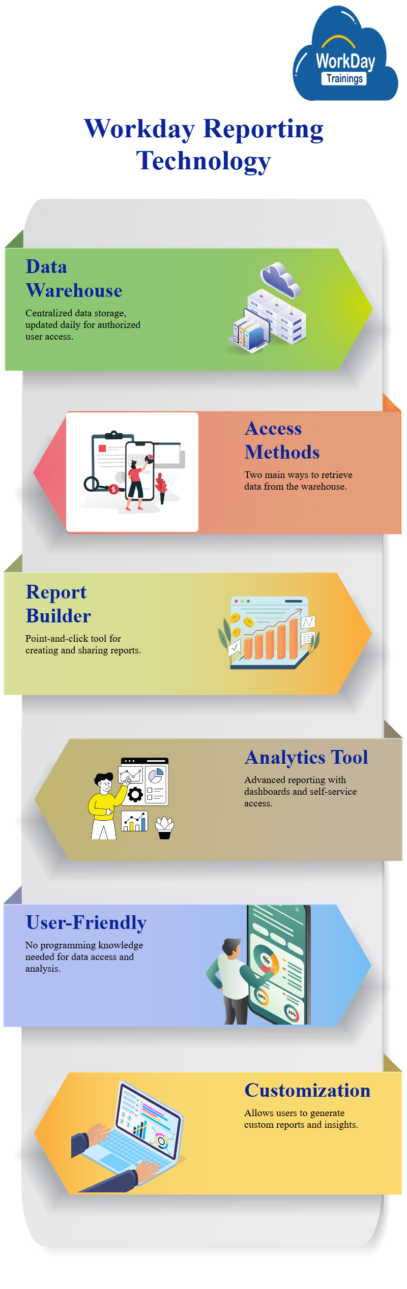 Workday’s Reporting Technology is based on a “Data Warehouse” model. This means that data is stored in a central location and can be accessed by authorized users. The data warehouse is updated regularly, typically daily, with new data from Workday’s transactional systems. Workday provides two main ways to access data in the data warehouse.