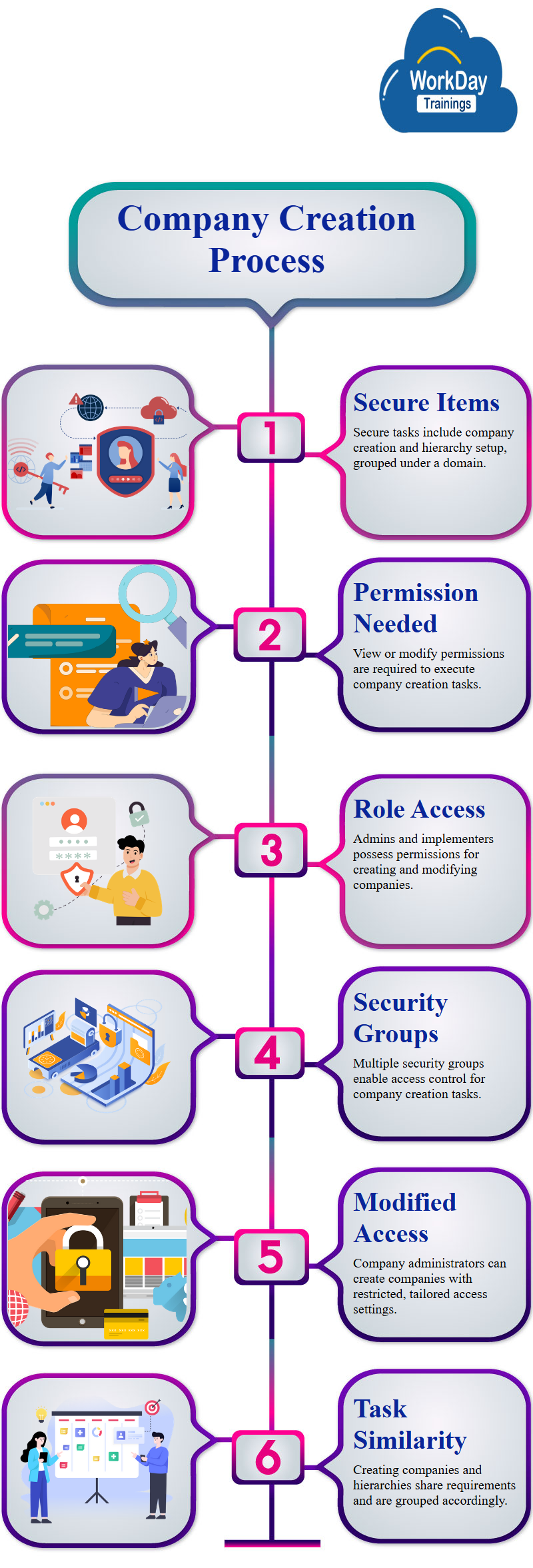 To create a company, permissions are needed, such as a view or modification level. The company administrator, implementers, and Workday integration administrator have the necessary permissions.