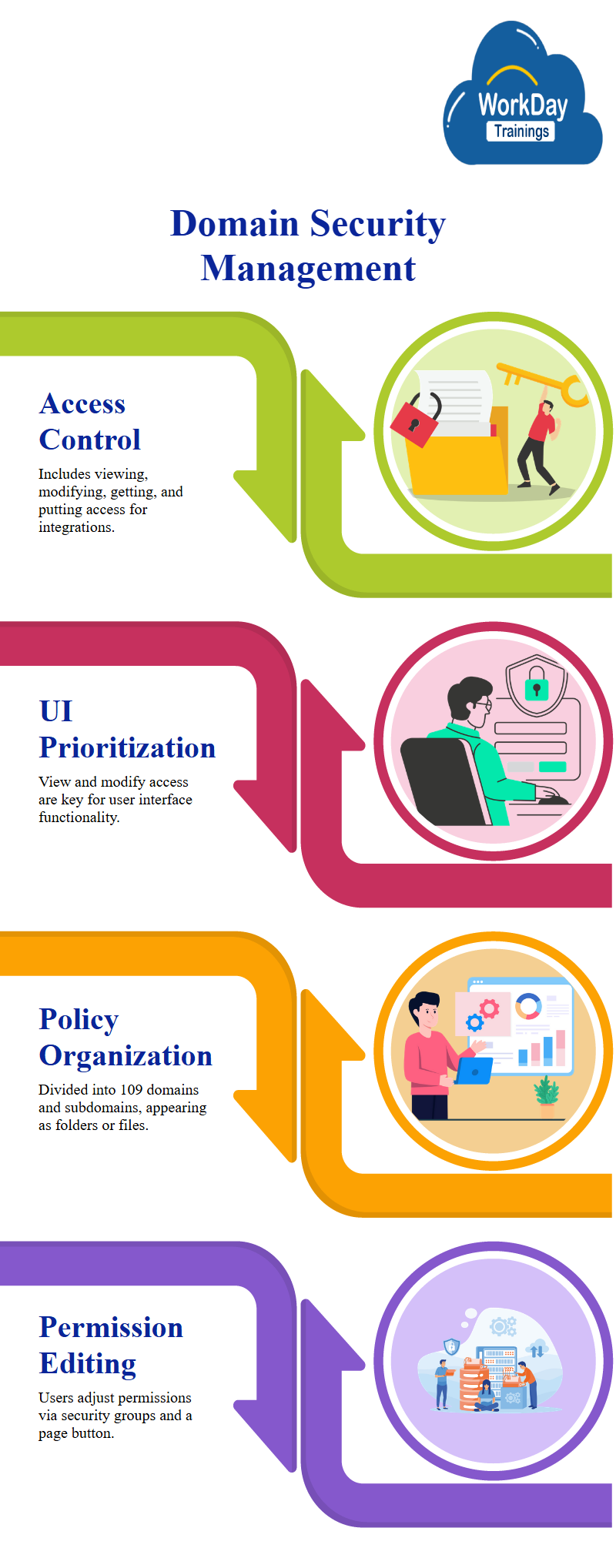 The domain security policy consists of viewing and modifying accesses, as well as getting and putting access for integrations. These terms are Workday web services equivalent terms, making them more relevant from an integration perspective.