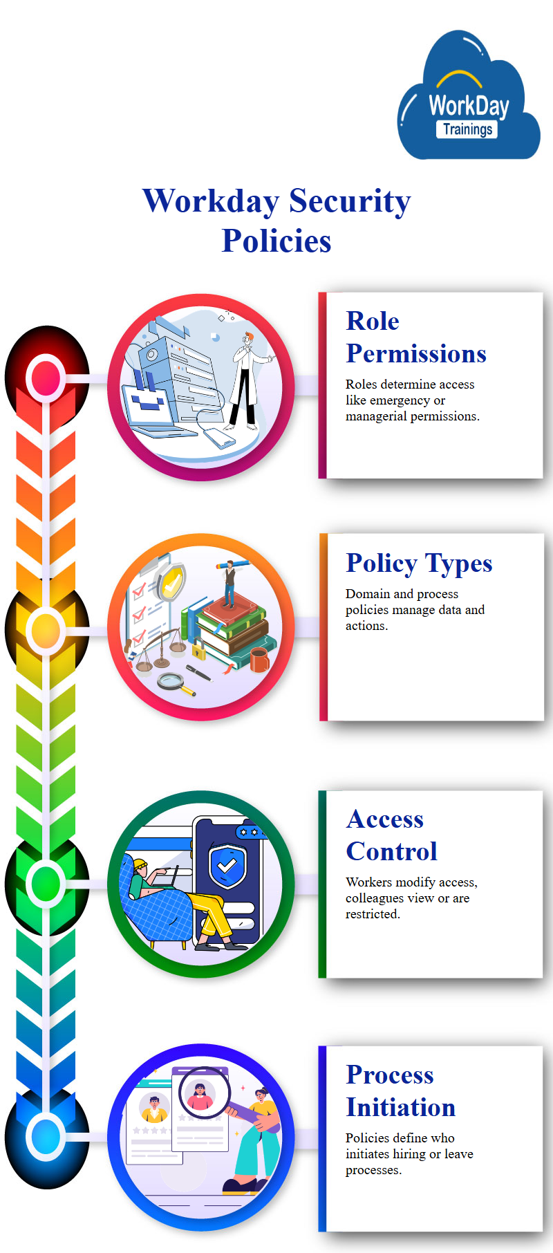 The security policy outlines two types of security policies: domain security policies, which provide permissions for viewing and modifying data, and business process security policies, which focus on the Workday business process actions that can be initiated.