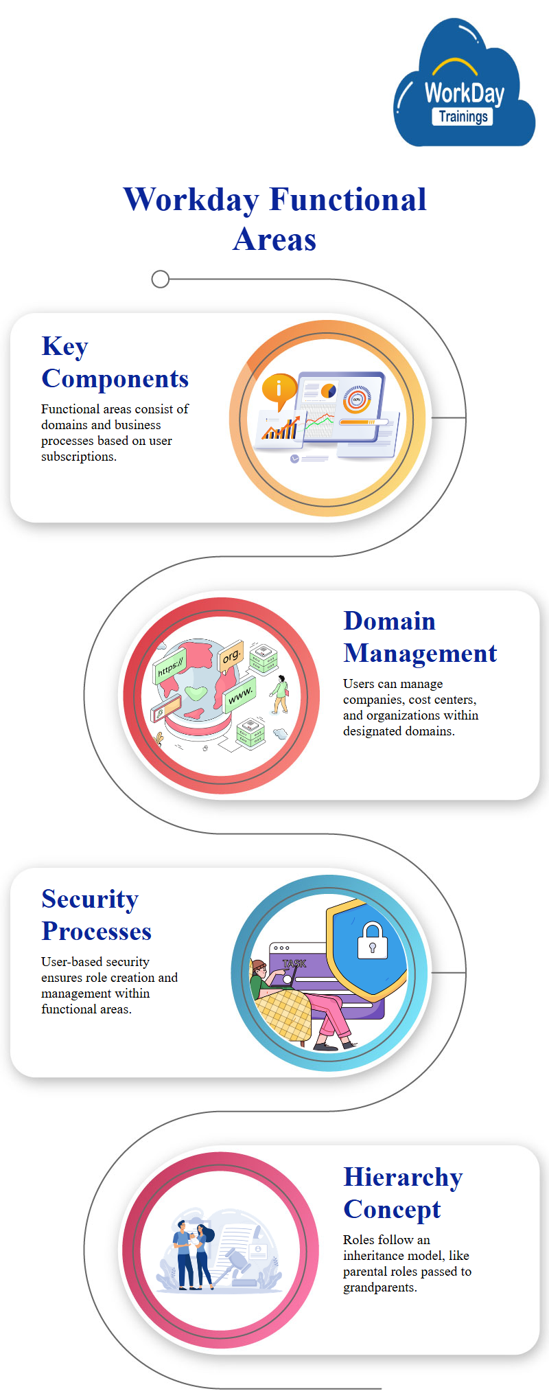 The area revolves around functional areas in Workday, which are categorized into domains and business processes. The functional areas are based on subscriptions and the user’s subscriptions.