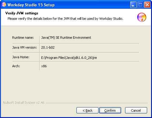 - If the JVM details are correct, then select Confirm; otherwise, click on Back to edit the location and version of the JDK settings.