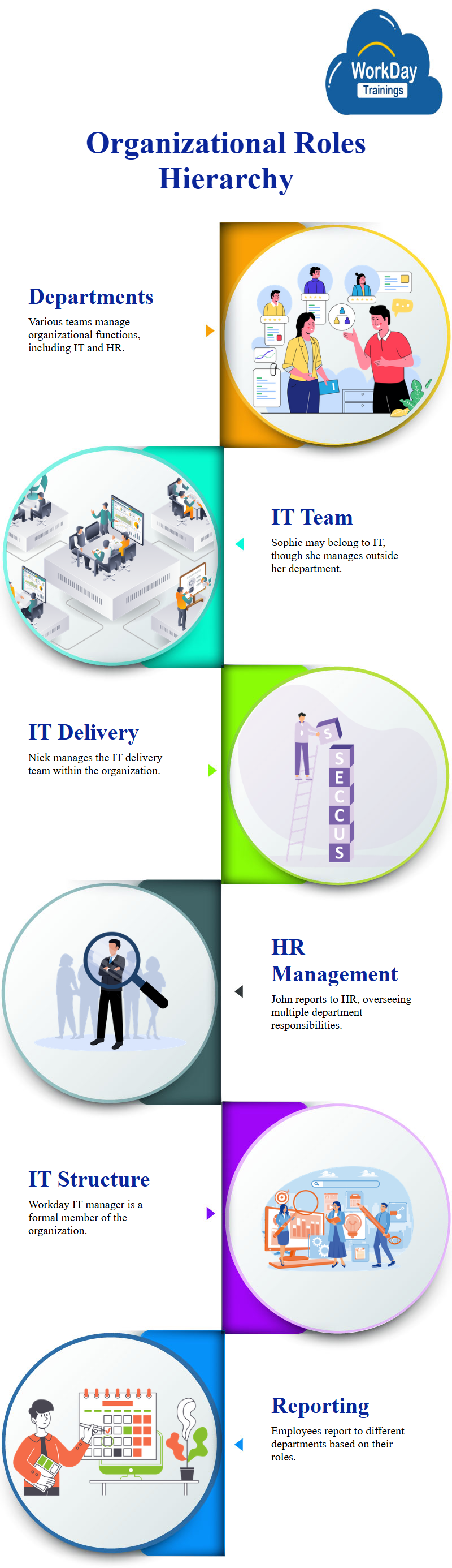 Sophie may be part of the IT delivery team, which is managed by Nick. Other workers like John, who is part of HR management, report to various departments. The subject then moves on to the structure of the I T management, where the workday manager of IT is a member of the organization.