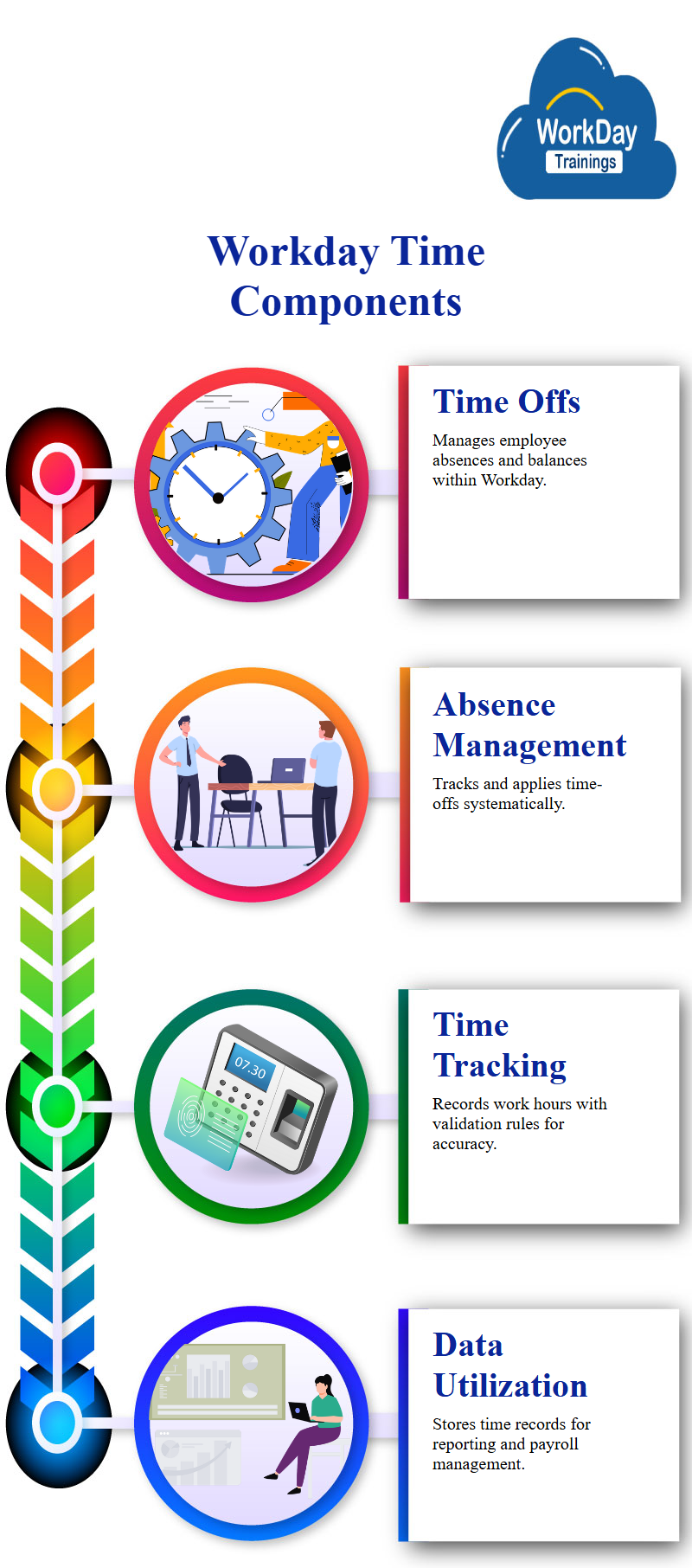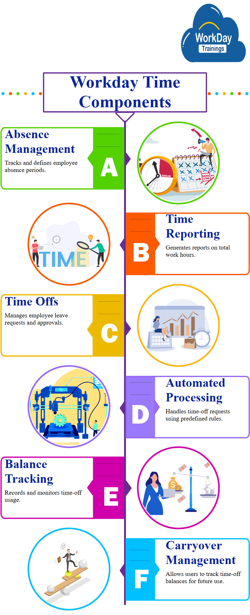 Absence is a Workday component used to manage the absence of employees. It allows the creation of time offs and tracking of that time offs and their balances. It is a part of Absence Management. Absence is used to define the periods of absence of employees, and the managers of Absence Management can define the rules for how the absence is calculated and recorded. Absence Management consists of the Absence business Process and Absence component.