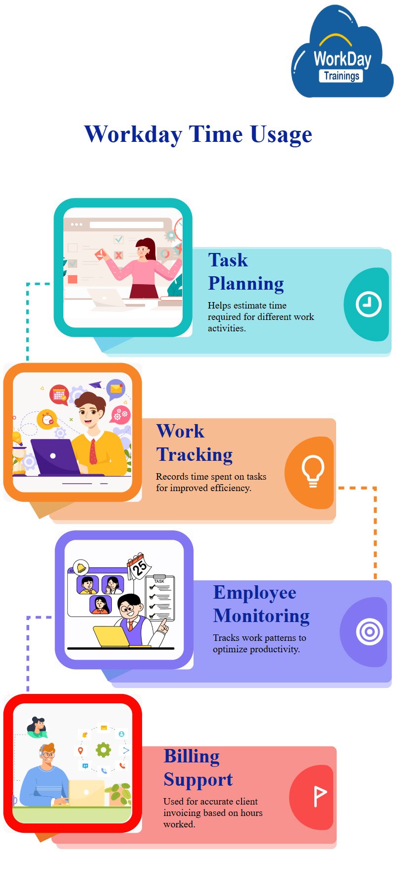 Workday Time Tracking refers to monitoring and recording the amount of time spent on tasks or activities during a workday. This can be done manually, through time-tracking software, or a combination. Time tracking can be used for various purposes, including improving productivity, monitoring employee work patterns, and billing clients for work performed.