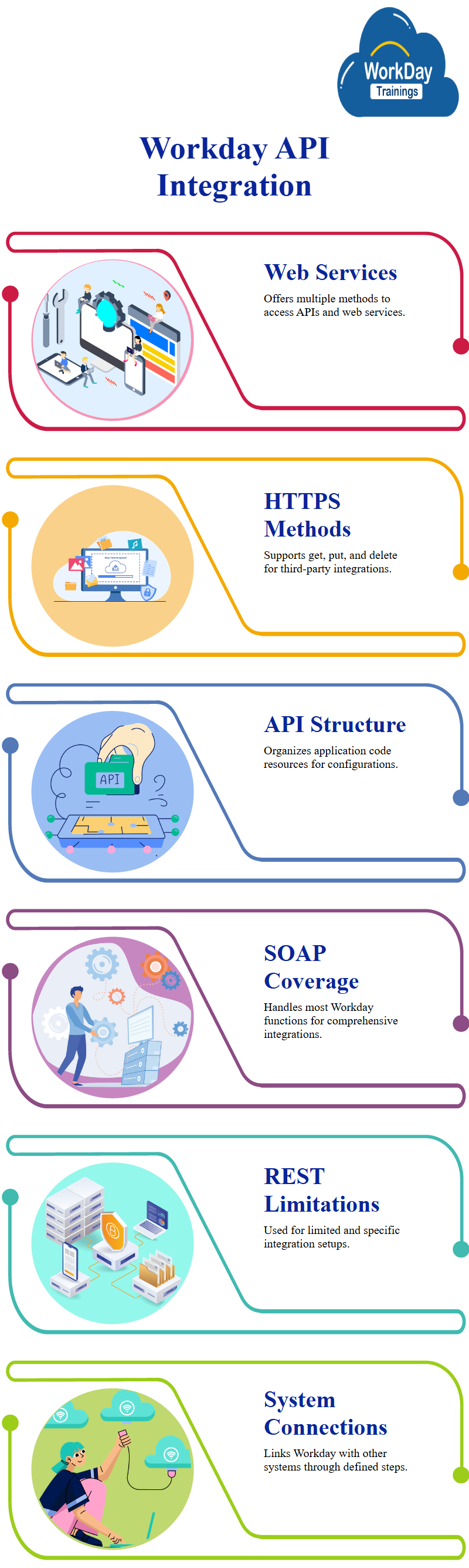 Workday web services offer multiple ways to access web services, including APIs. Workday apps allow HTTPS-related methods like get, put, and delete, allowing enterprises to expose their services to third parties. Workday APIs provide the structure of the workday application and organise code resources for configurations.