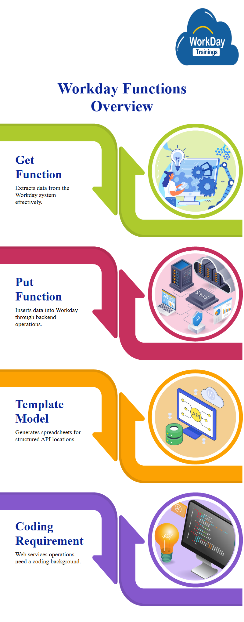 Workday has two types of functions: get and put. Get involves extracting data from the Workday system, while put consists of inserting data into Workday. The template model is used for this purpose, as it generates a workday web service spreadsheet model that contains the structure API of the complete location.