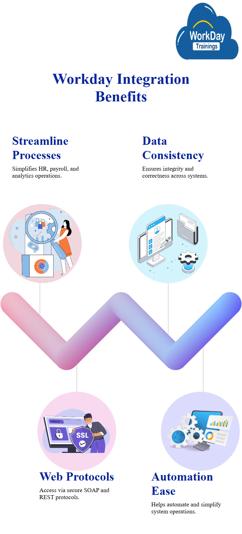 Organizations can simplify processes and strengthen data integrity and consistency by connecting Workday with external systems using its web services, such as payroll providers, time and attendance systems, and custom apps.